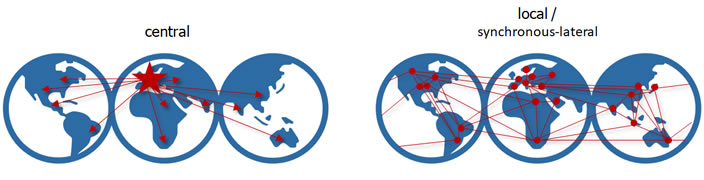 Cultural transformations traditionally begin at the »centre«, meaning from an organization’s headquarters and spreading from this »epicentre« to other areas and through the entire organization in order to become »global«. The direction of change therefore goes from »central« to »local«.